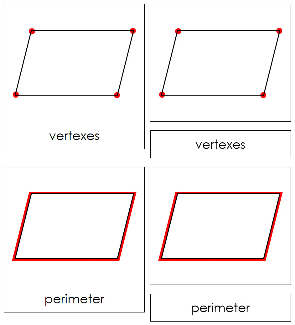 This set includes 8 parts of a parallelogram: sides, angles, vertexes, base, perimeter, area, altitude, and diagonal.