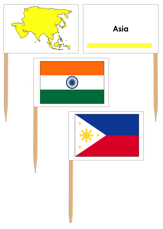 Continent Cards are approx. 5" x 7½", all other cards are in a 3-part card format (approx. 3½" x 3¼", cards without labels are approx. 1" shorter). Cards have yellow borders. Maps print on 8½" x 11" paper. The colored map is colored according to the traditional Montessori map of Asia.