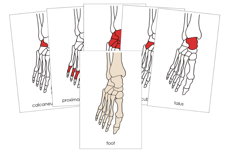 Foot Nomenclature Cards are formatted as 3-part cards and include a blackline master. The 16 bones of the human foot: foot bones, phalanges (toes), distal phalanges, middle phalanges, proximal phalanges, metatarsals (sole), tarsus (ankle), calcaneus, cuboid, talus, navicular, medial cuneiform, intermediate cuneiform, lateral cuneiform, tibia, and fibula.