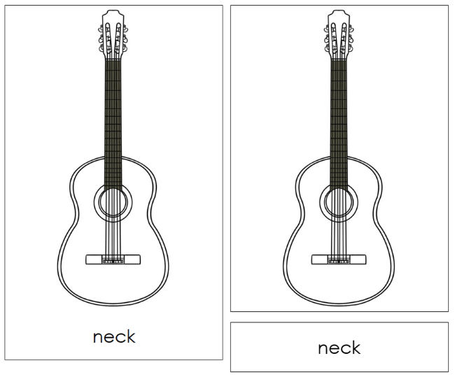 The Guitar Nomenclature Cards are formatted as 3-part cards and include a blackline master. The 12 parts of the guitar: guitar, body, soundhole, bridge, neck, headstock, tuners, fret, saddle, nut, string, and pegs. *Smaller parts of the guitar are colored in red on the individual cards.