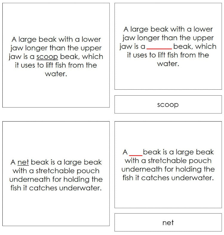 This set includes 12 birds, each accompanied by a description of its beak and function.
