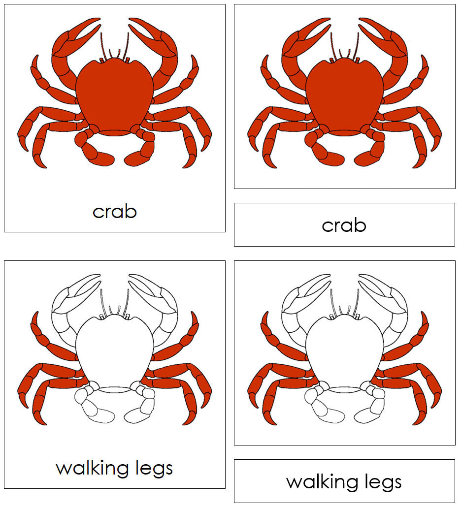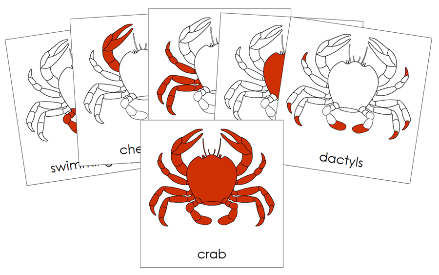 The Crab Nomenclature Cards are formatted in 3-part cards and include a blackline master. The 16 parts of the crab: crab, chelae, chelipeds, antennae, antennules, compound eyes, rostrum, walking legs, swimming legs, dactyls, propodi, carpus, merus, coxa, carapace, and abdomen.