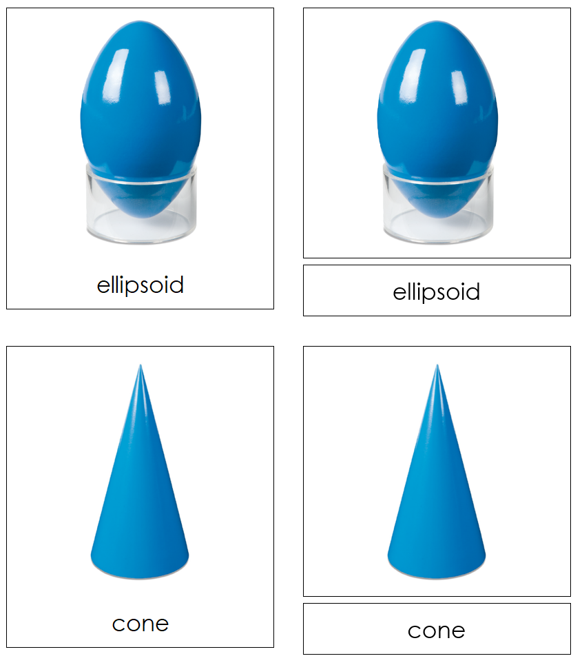 The Montessori geometric solids 3-part cards help children learn the names and recognize various geometric solids, enhancing vocabulary and spatial visualization and laying a foundation for future geometry skills.