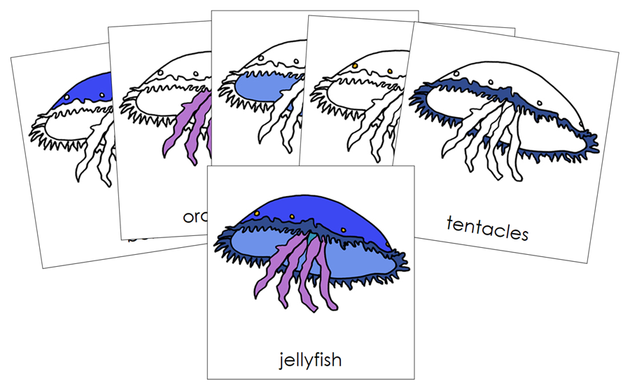 The Jellyfish Nomenclature Cards are formatted in 3-part cards and include a blackline master. The 8 parts of the jellyfish: jellyfish, bell, subumbrella, rhopalium, oral arms, tentacles, stinger cells, and mouth.