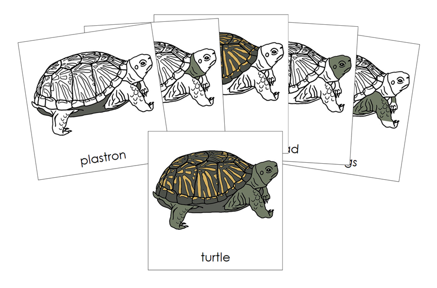 The Turtle Nomenclature Cards are formatted as 3-part cards and include a blackline master. The 10 parts of the turtle: turtle, carapace, head, plastron, forelegs, hind legs, tail, eyes, neck, and feet.